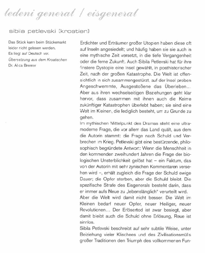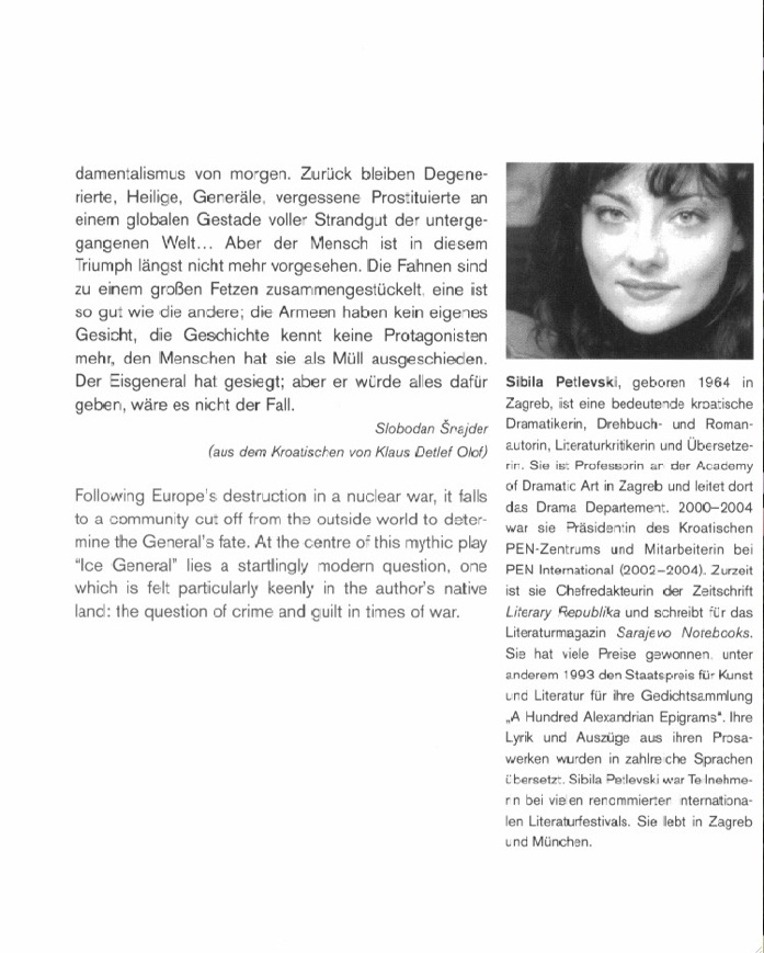 Drama, Written in Croatian. Premiered at Croatian National Theatre-Varaždin, February 28th 2007 (stage reading; dramaturgy by A. Armanini & K. Krčar); Radio-play version premiered at Croatian Radio 3 (2006). Directed by R. Mesarić; Croatian version translated by the author published in: Forum 2010. No- 1-3, pp. 213-283; German translation by A. Bremer, in: Relations (3-4, 2006), pp. 152-185