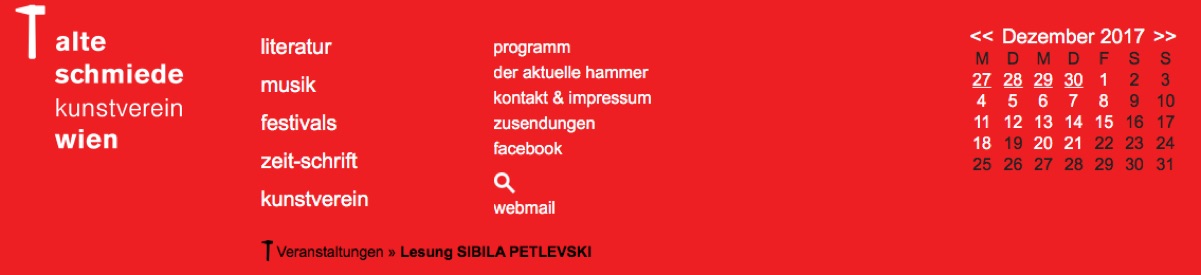 LQKULTURPOLITISCHES SCHWERPUNKTJAHR 2017: KROATIEN – ÖSTERREICH • in Zusammenarbeit mit der Botschaft der Republik Kroatien in Wien • SIBILA PETLEVSKI (Zagreb) zweisprachige Lesung kroatisch-deutsch aus ihrer TABU–Romantrilogie (in Teilen aus dem Kroatischen übersetzt von Boris Perić und Blažena Radas): I: Vrijeme laži (Die Zeit der Lügen, 2009) – II: Bilo nam je tako lijepo! (Wir hatten es so schön!, 2011) – III: Stanje sumraka (Dämmerzustand, 2013 – alle: Fraktura, Zaprešić) • Einleitung und Vorstellung der Trilogie: BORIS PERIĆ (Zagreb)